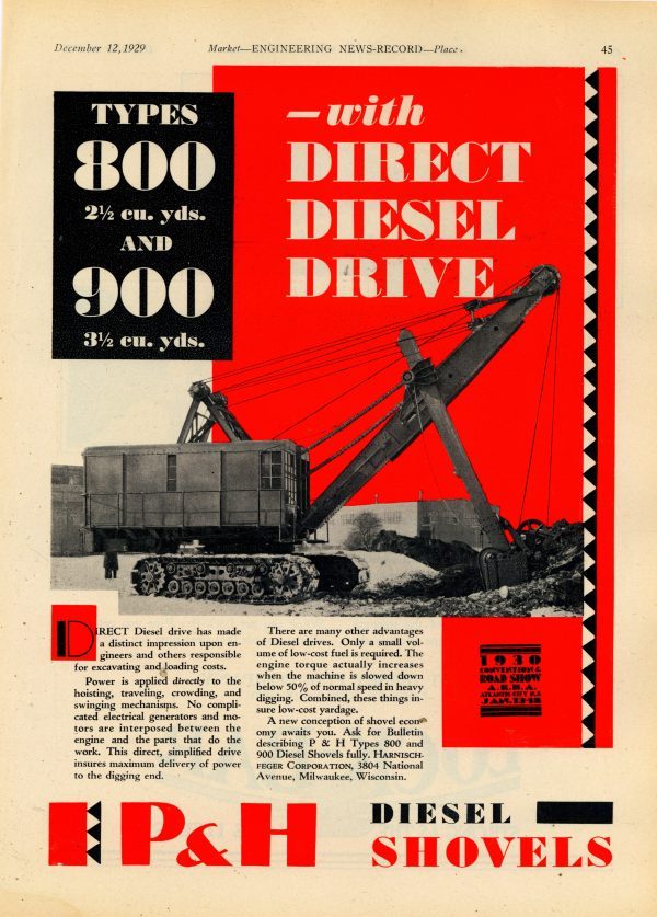 1929 P & H Model 800/900 Excavator Ad: Shovel, Crane, Dragline – Harnischfeger – Milwaukee, Wisconsin