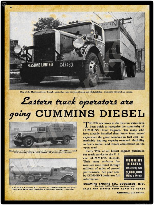 1935 Cummins Diesel Engines Collectible Metal Sign: Keystone Limited – Harrison Motor Freight