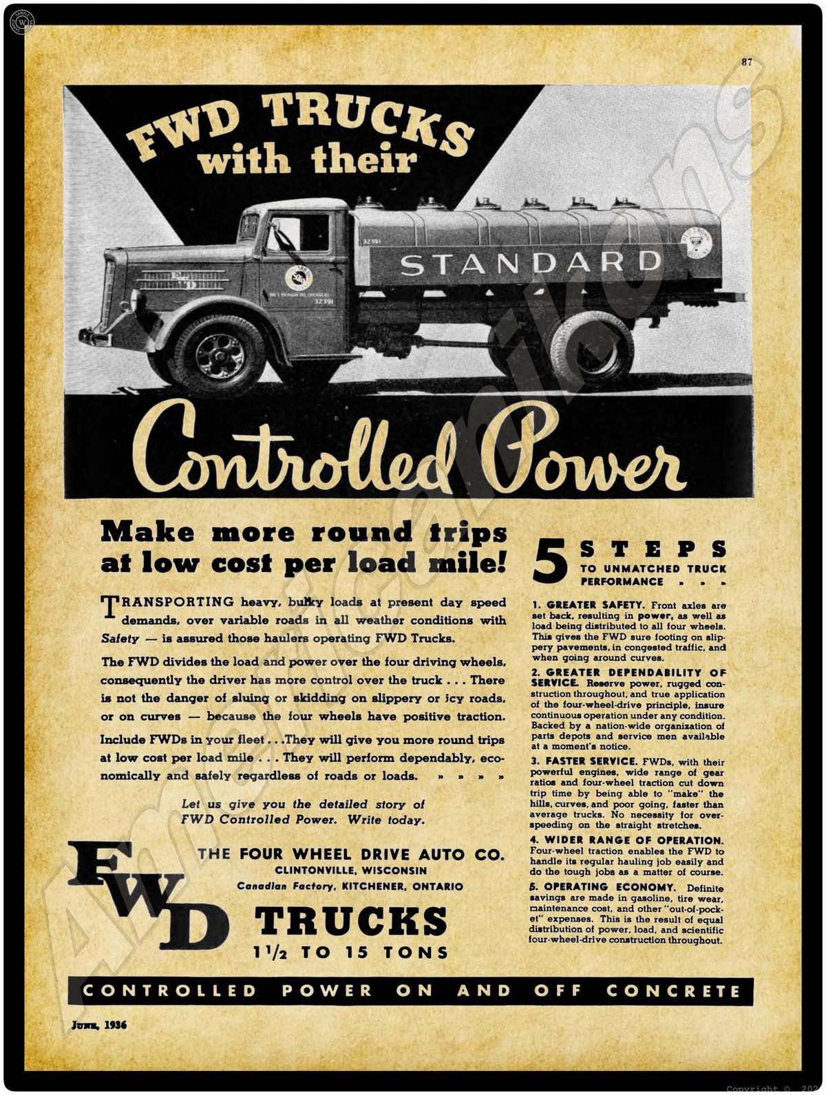 1936 Four Wheel Drive FWD Trucks Collectible Metal Sign: Standard Oil Tanker Truck – Clintonville, Wisconsin