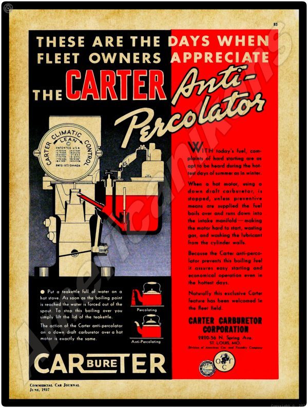1937 Carter Carburetor Collectible Metal Sign: St. Louis, Missouri