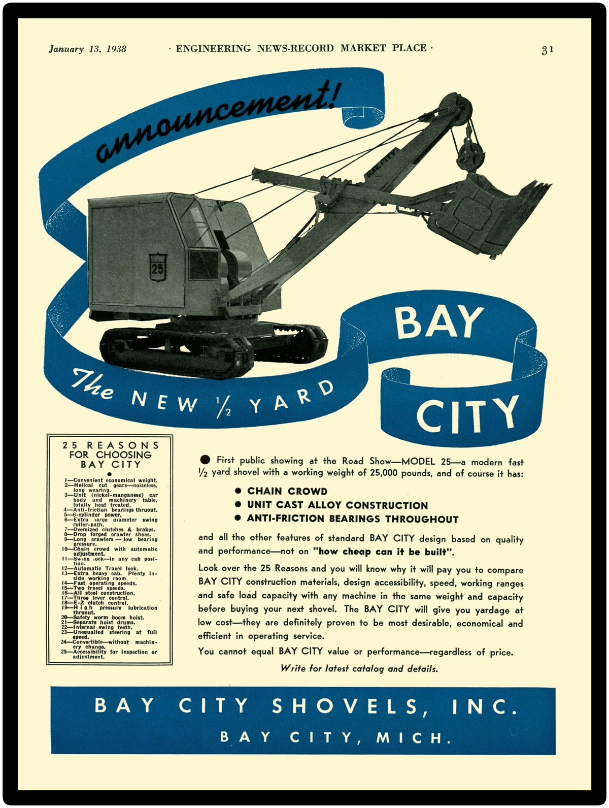 1938 Bay City Shovels Model 25, 1/2 Yard Shovel Reproduction Metal Sign