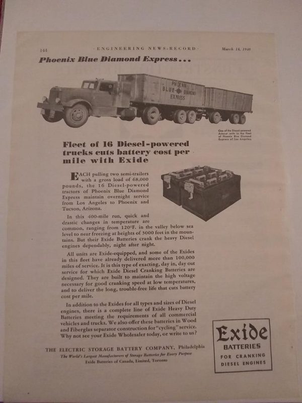 Vintage 1940 Autocar Tractor in Exide Batteries Advertisement. Phoenix Blue Diamond Express