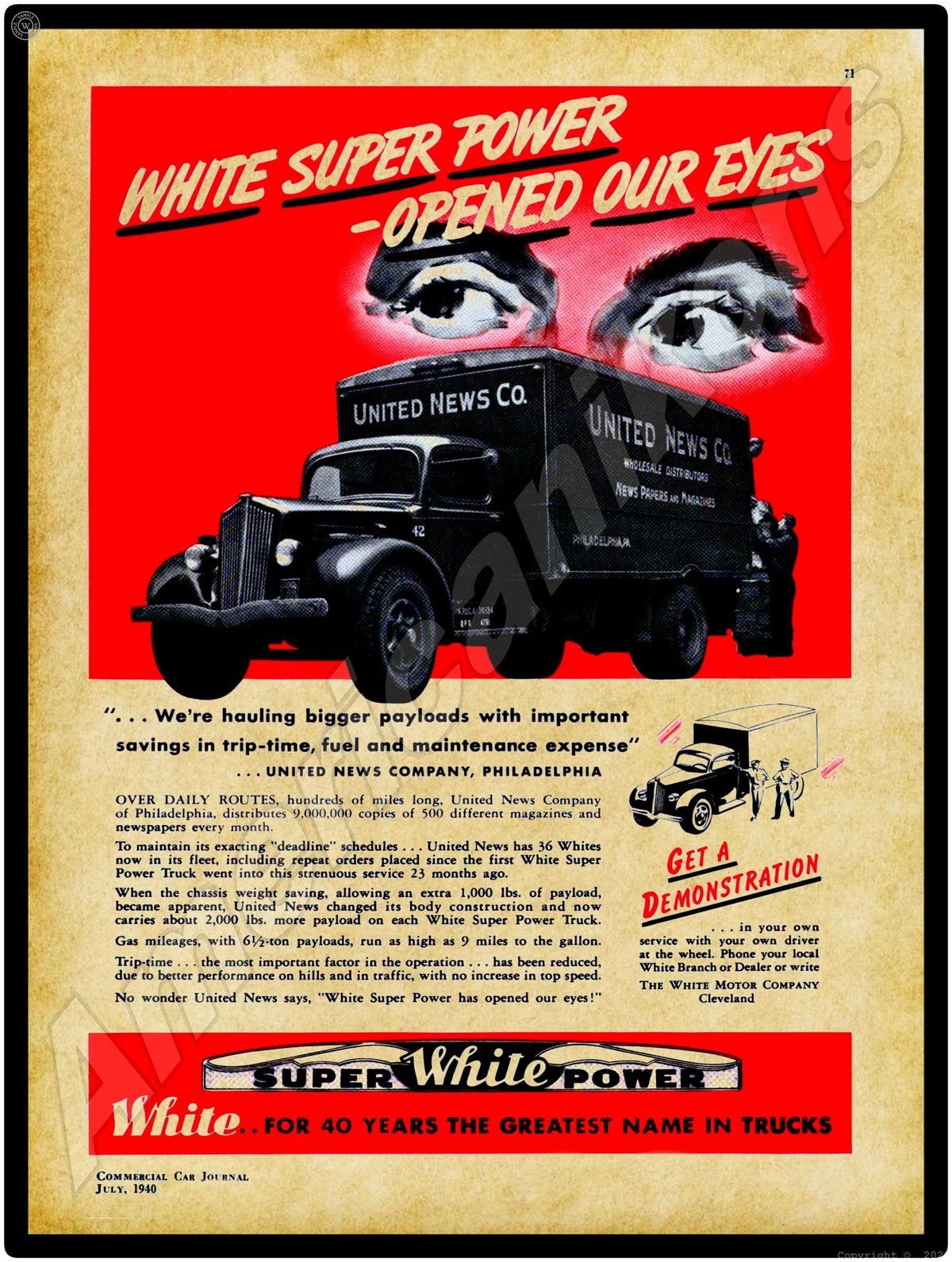 1940 White Trucks Collectible Metal Sign: Super White Power – United New Company – Philadelphia