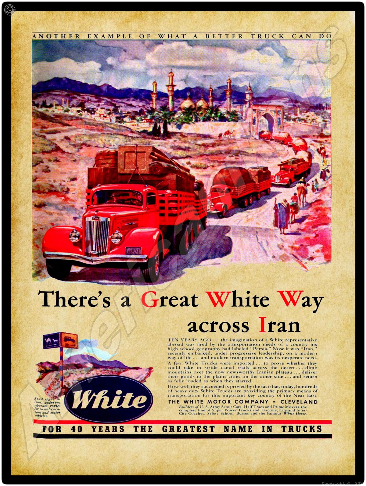 1942 White Trucks Collectible Metal Sign: World War Two Truck in Iran