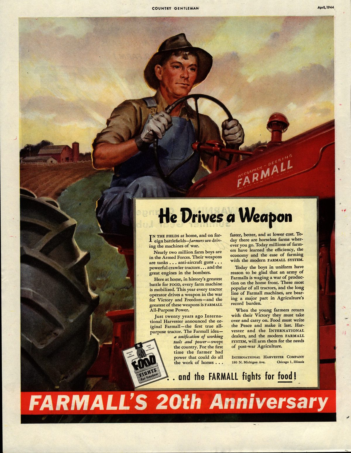 1944 McCormick Deering Farmall by International Harvester Collectible Advertisement: “He Drives a Weapon.”