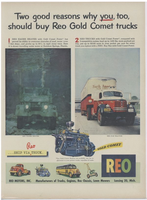 1951 REO Trucks Collectible Advertisement: F-22 Tractor, Eager Beaver, Gold Comet
