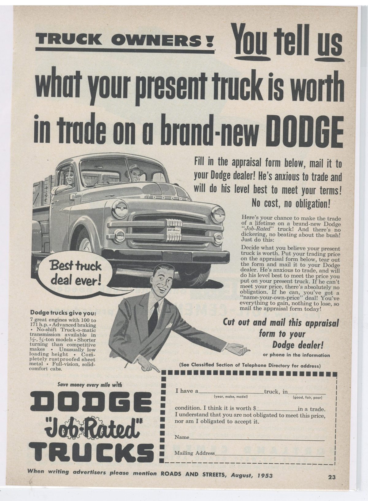 1953 Dodge Trucks Collectible Print Advertisement, Sign: Job-Rated
