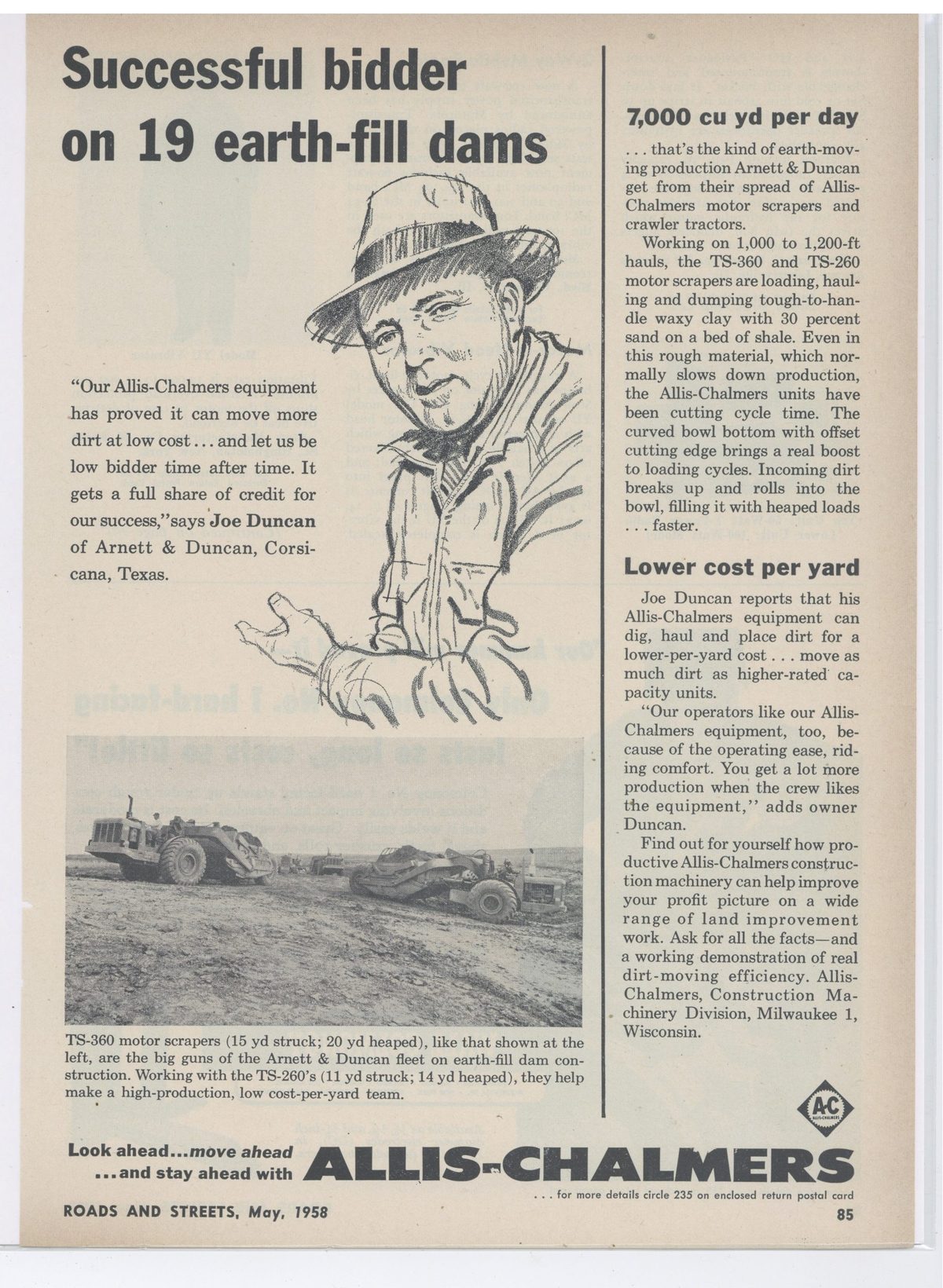 1958 Allis Chalmers Equipment Collectible Print Advertisement, Sign: TS-360 Motor Scraper in Corsicana, Texas