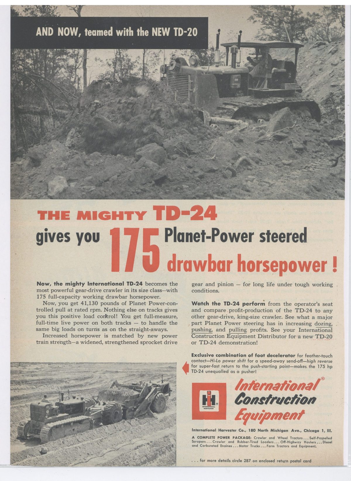 1958 International Harvester Equipment Collectible Print Advertisement, Sign: TD-24 Tractor