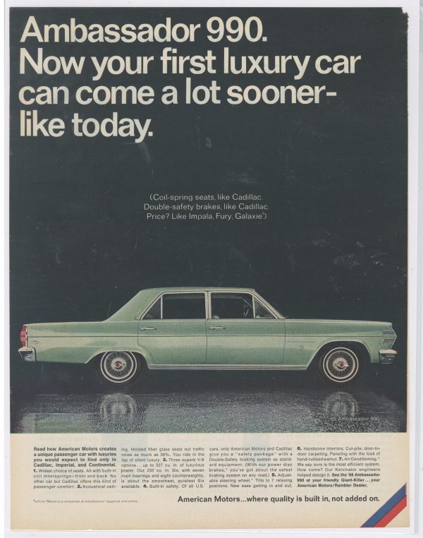 1966 AMC American Motors Ambassador 990 Collectible Print Advertisement, Sign