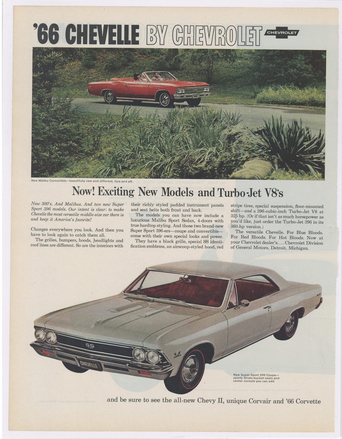 1966 Chevrolet Chevelle Collectible Print Advertisement, Sign: SS 396 & Convertible