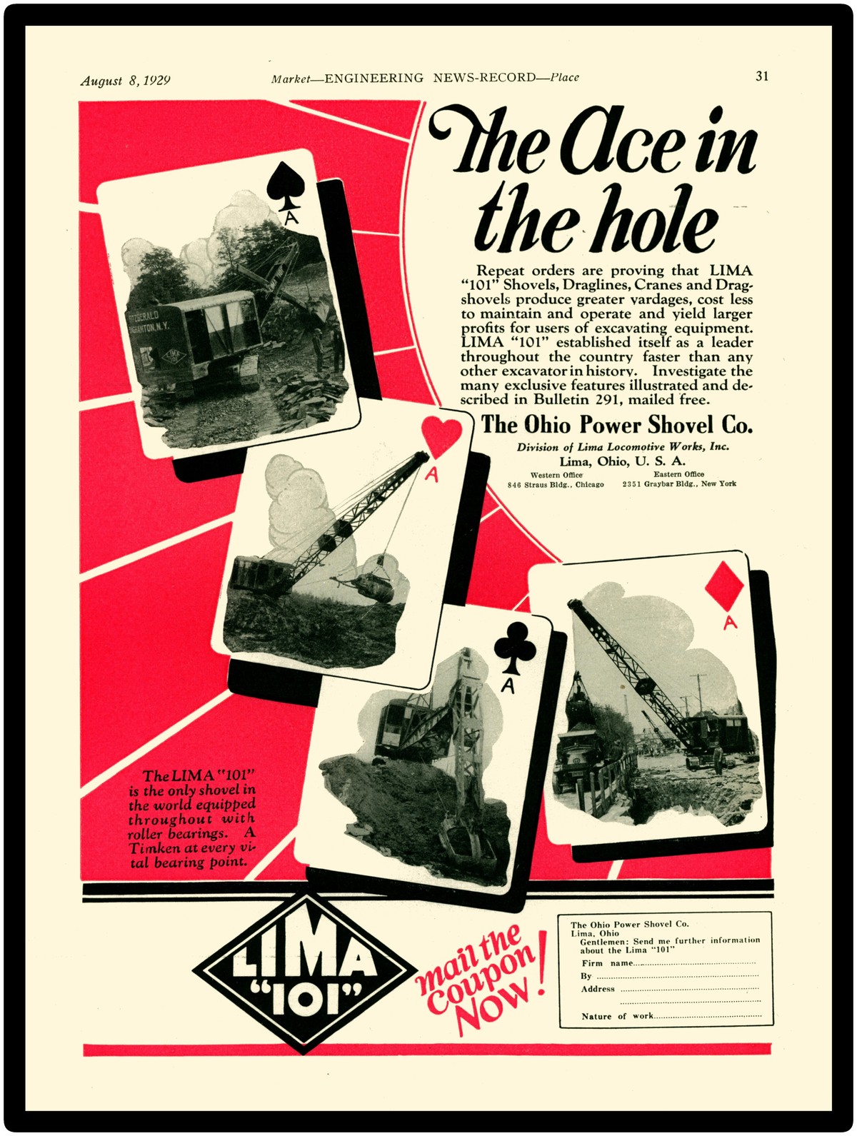 Collectible 1929 Lima Locomotive Works’ Ohio Power Shovel New Metal Sign: Ace in the Hole.