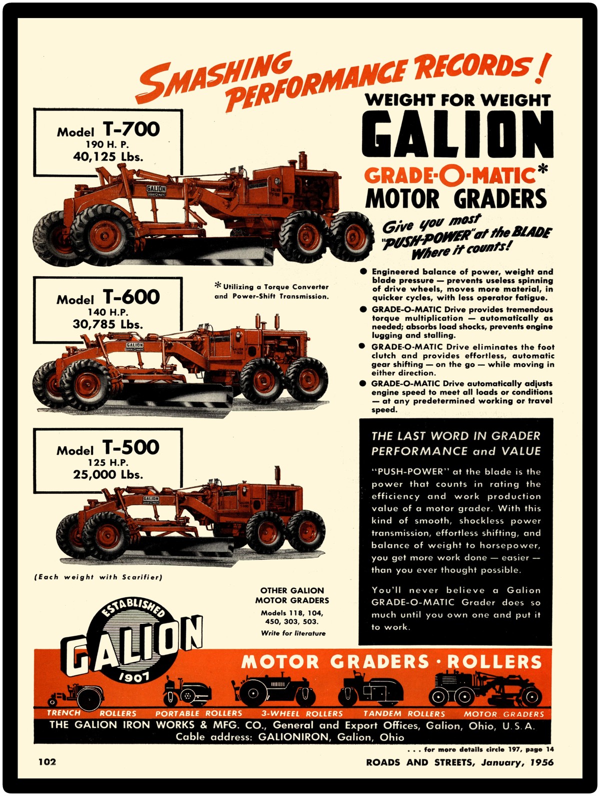 Galion Iron Works 1956 Collectible Metal Sign: Grade O Matic Road Graders T-700, 500., 600