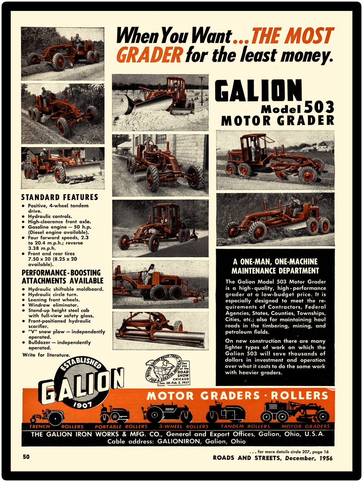 Galion Iron Works Heavy Equipment 1956 Collectible Metal Sign: Model 503 Motor Road Grader