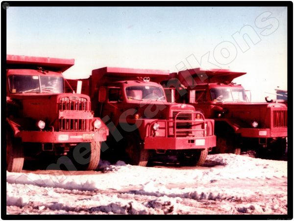 International & Autocar Trucks Collectible Metal Sign: Three Red Dump Trucks