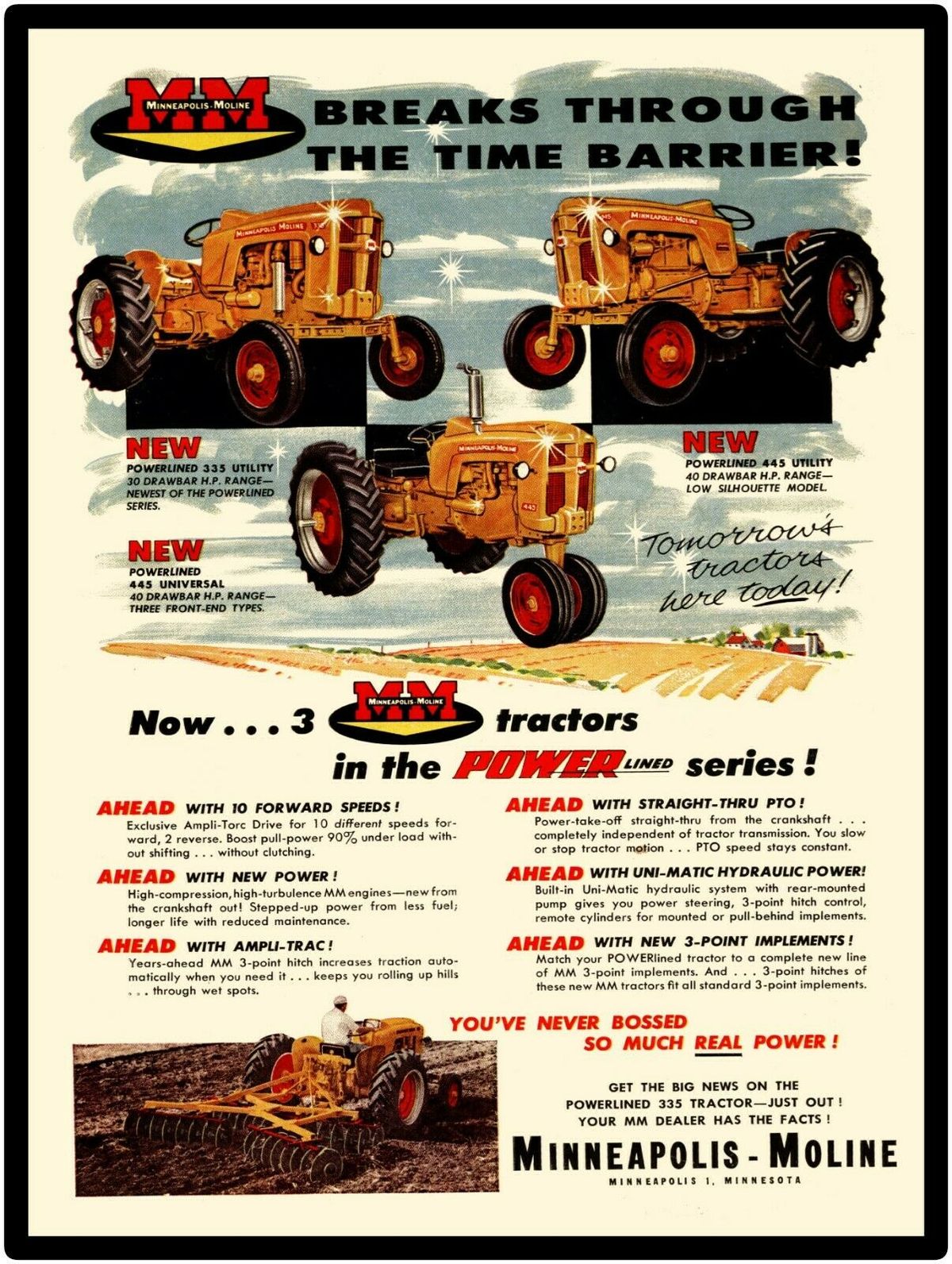 Minneapolis Moline Farm Equipment New Metal Sign Models 335/445 Tractor Featured