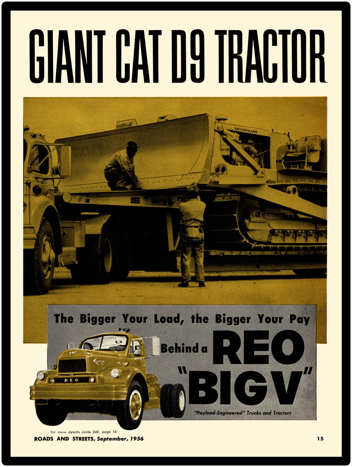 REO Trucks 1956 Collectible New Metal Sign: REO Big V with Caterpillar D9 Tractor