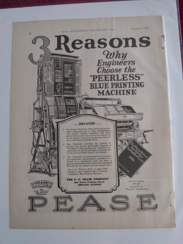 Very nice 12″ x 9″ original ad for the Pease Peerless Blue Print Reading Machine Company, 1929.