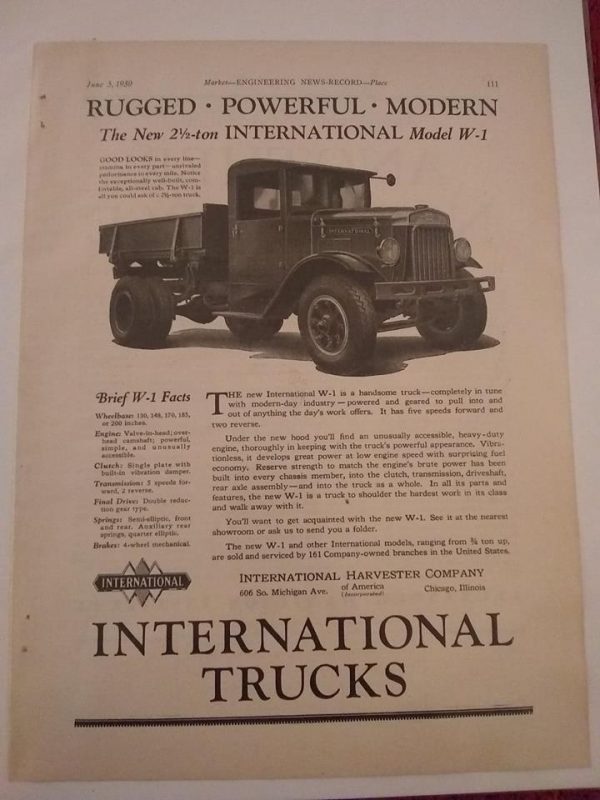 Vintage 1930 IH International Harvester Trucks Model W-1, 2.5 Ton Dump Truck Collectible Ad Advertisement.