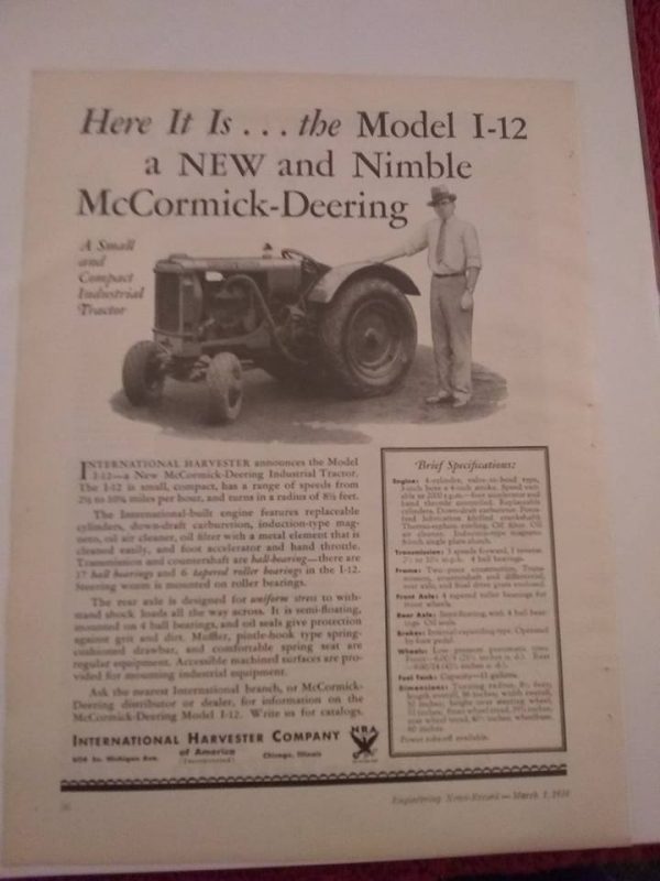 Vintage 1934 IH International Harvester McCormick Deering Model I-12 Industrial Tractor Collectible Ad Advertisement.