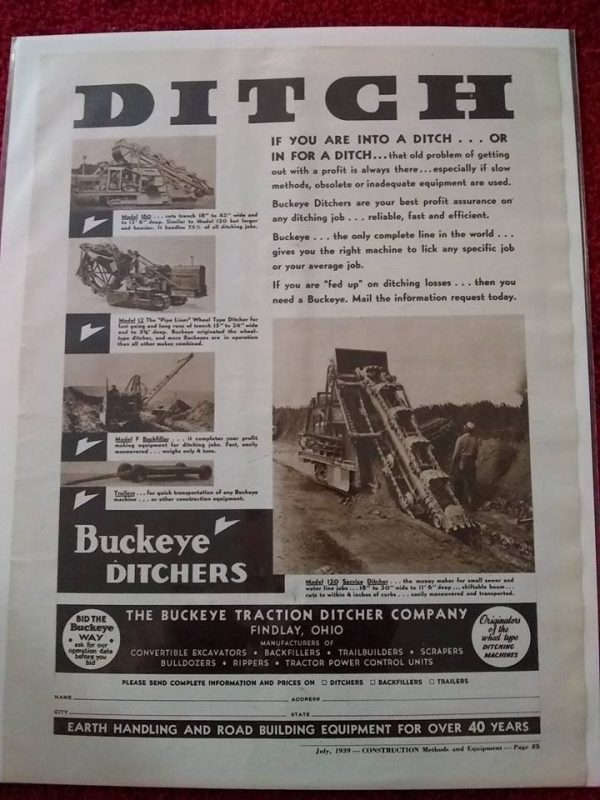 Very nice 13″ x 10″ original ad for Buckeye Traction Ditcher Company, Findlay, Ohio.