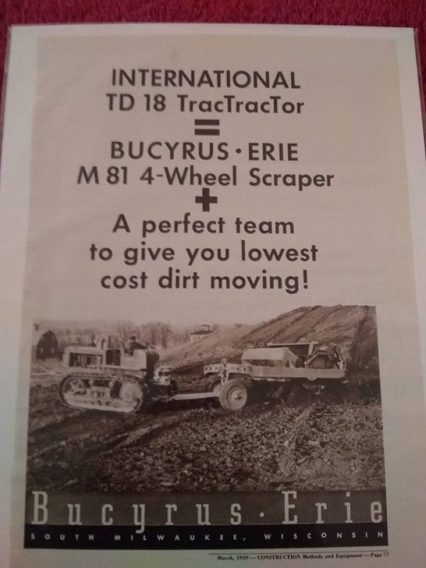 Vintage 1939 IH International Harvester TD-18 TracTracTor Diesel Tractor Featured in Bucyrus Erie M 81 4 wheel Scraper Collectible Ad Advertisement.