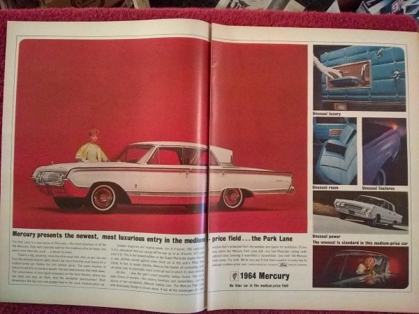 Vintage Collectible 1964 Mercury Park Lane 2 Page Automobile Advertisement.