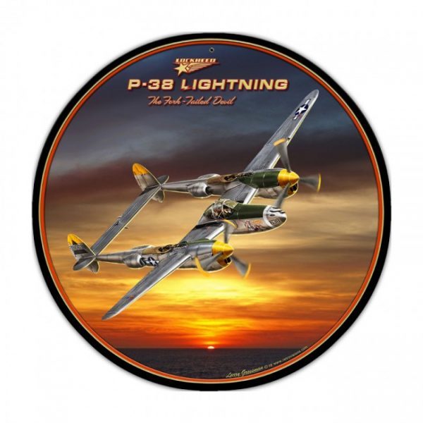The Vintage Lockheed Martin P-38 Lightning Metal Sign measures 28 inches in diameter and weighs around 7 pounds. Manufactured in the USA, the sign is crafted out of heavy-gauge 24 gauge US steel and is sublimated to make the image a part of the powder coating. The sign is drilled and riveted.