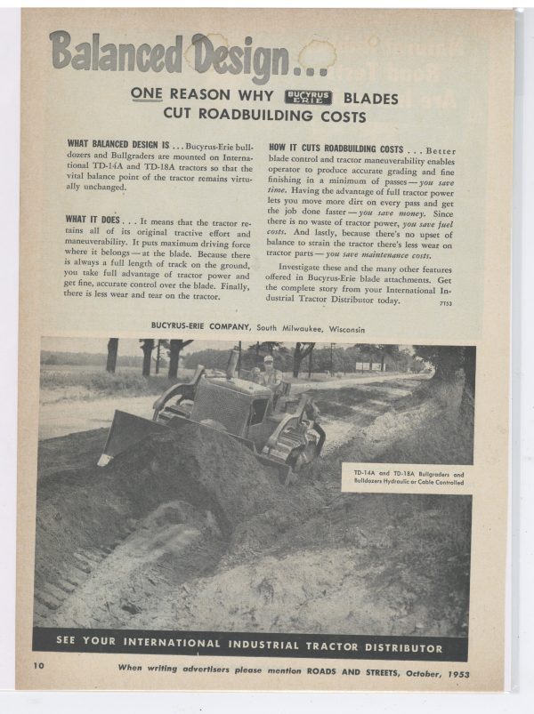 Vintage International Harvester Equipment Collectible Print Advertisement: TD-14A Tractor with Bullgrader by Bucyrus Erie