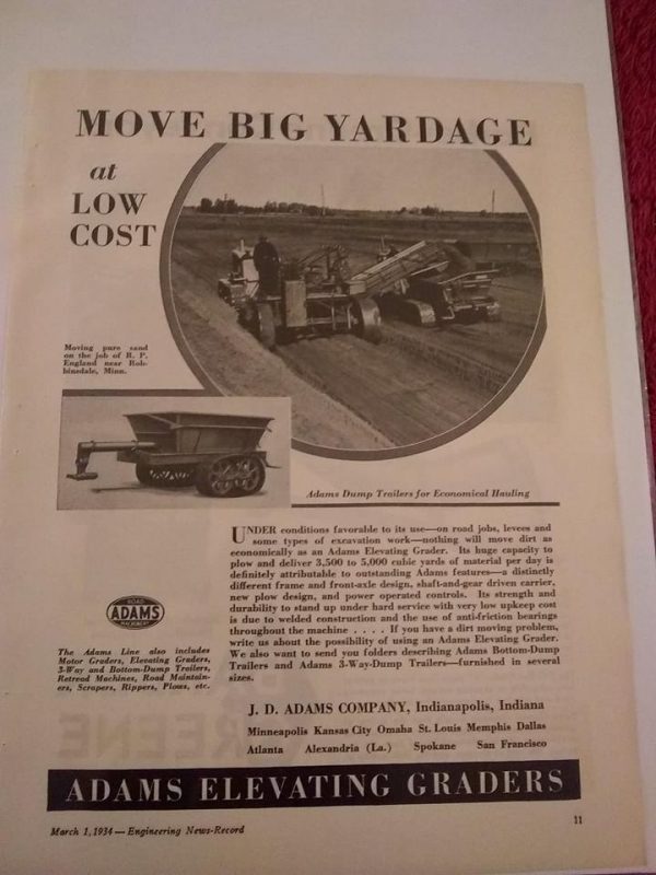 Vtg. 1934 J.D. Adams Co. Advertisement: Adams Elevating Grader, Dump Trailer